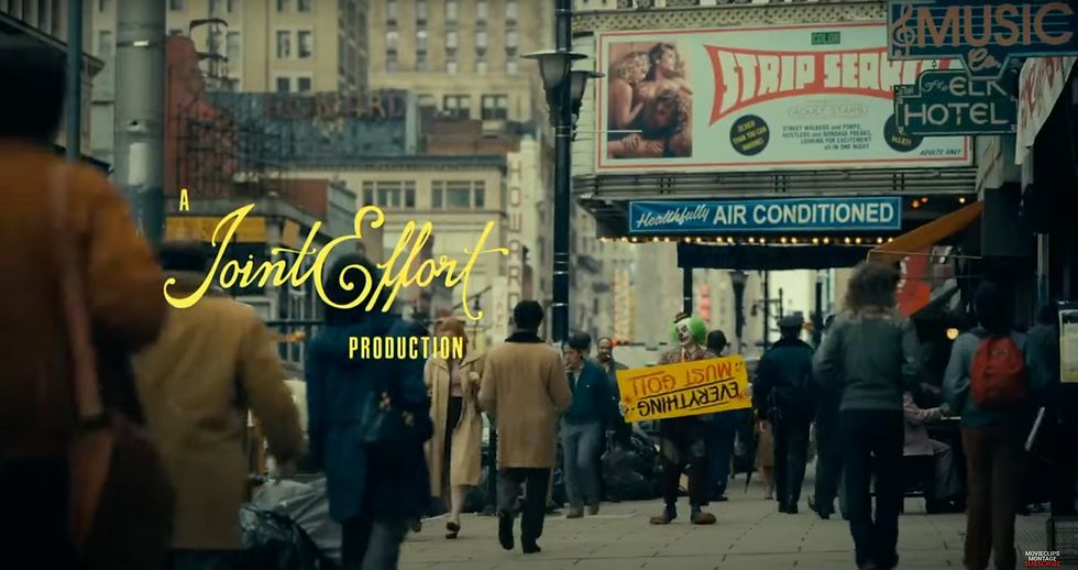 The film opens with a slow zoom in to a close-up of Arthur Fleck applying his clown makeup. The editing is deliberate, moving slowly to create an intimate yet uncomfortable atmosphere and focuses on the protagonist, There's a rhythm to the sequence that syncs with the melancholic soundtrack, which is haunting and sorrowful and reinforces Arthur's desolation and the film's dark tone.